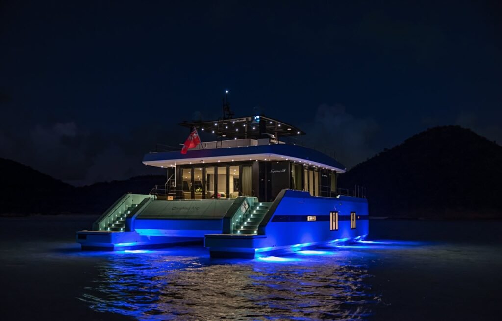 The Sunreef Supreme 68 Power ‘Blue’ is a testament to visionary design and meticulous craftsmanship, offering an unparalleled commitment to excellence. This luxury power catamaran combines striking aesthetics with advanced engineering, boasting a total living space of 3000 square feet – providing the expansive feel of a superyacht experience on a vessel below 24 meters. Its hull is constructed from Advanced Composites and the superstructure from GRP (Glass Reinforced Plastic), ensuring durability and a sleek finish.