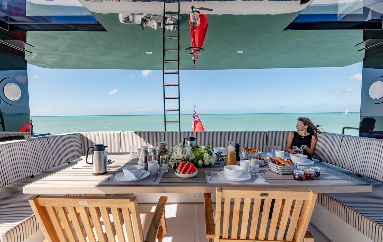 Your charter experience aboard the cat is enhanced by a professional crew, including a Captain, Stew, and Deckhand, ensuring discreet service and a worry-free journey. The dedicated three-person crew is trained to provide a five-star service, anticipating every need for our luxury clientele, allowing you to simply relax and enjoy.