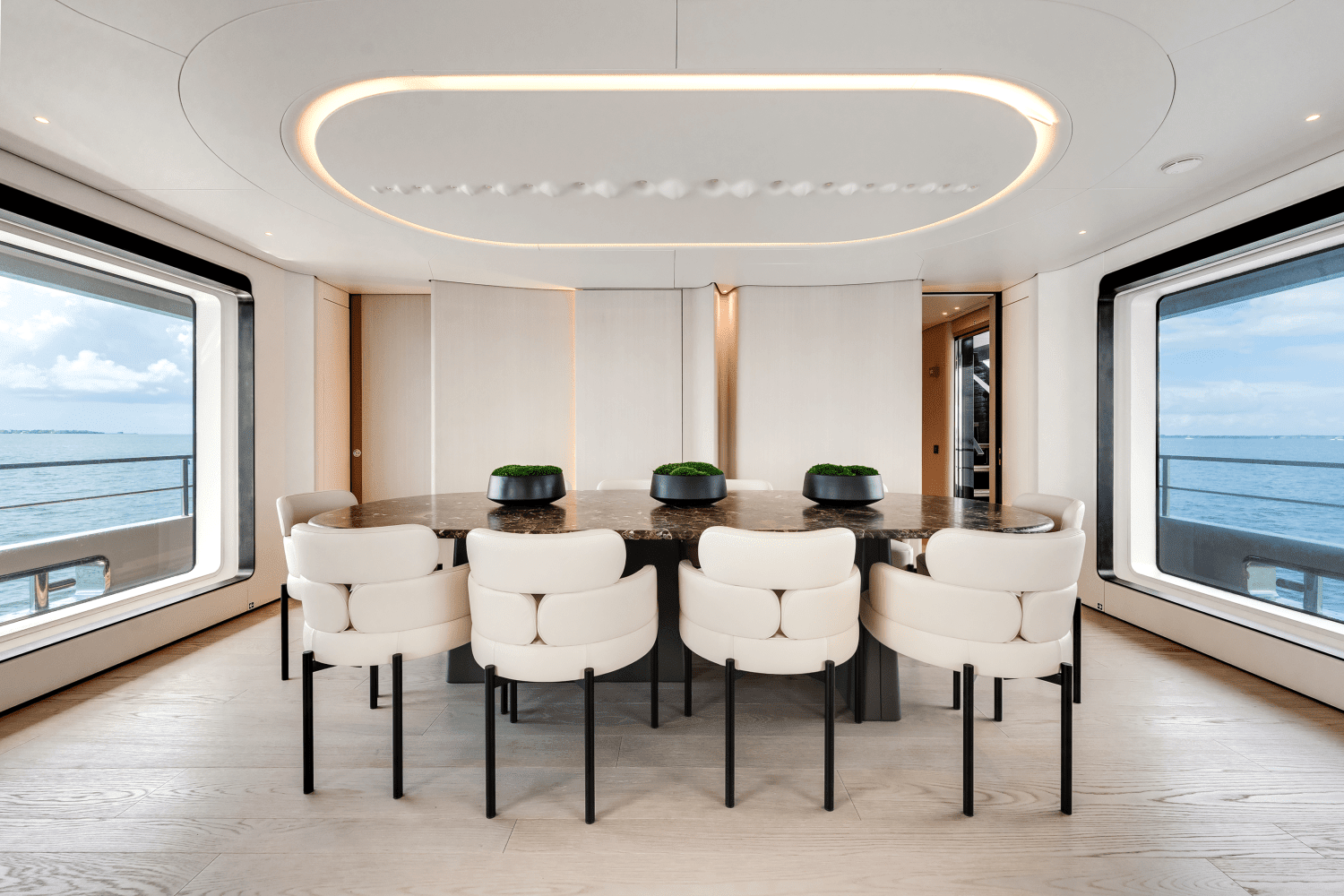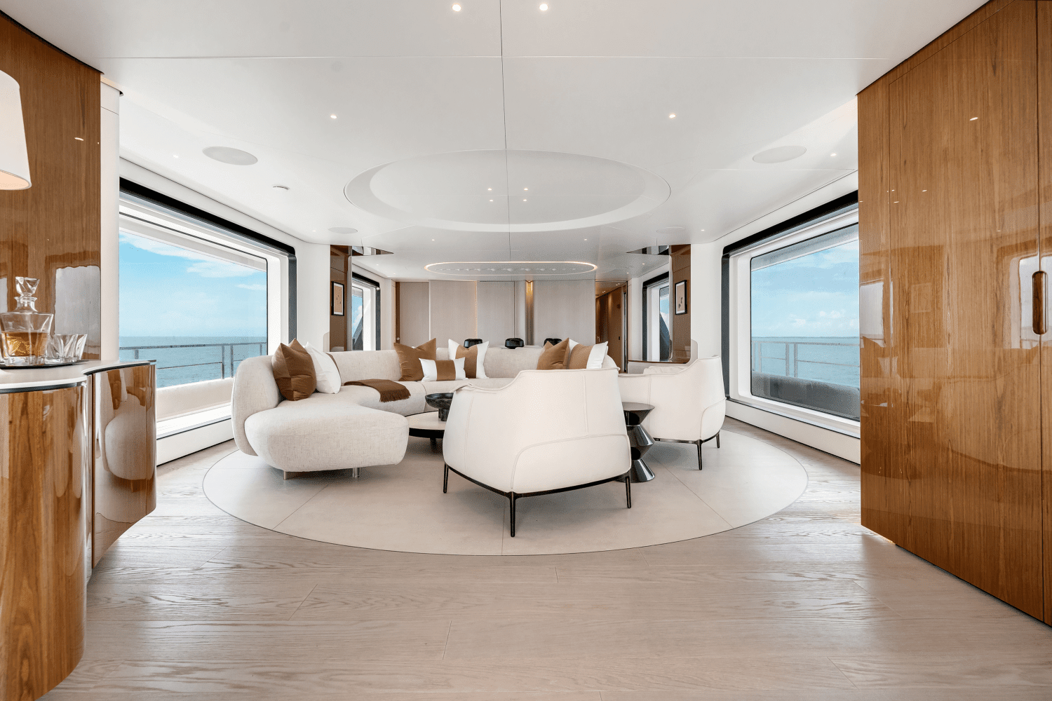 Inside, the Azimut Grande 36 Metri delivers a residential atmosphere rarely achieved on yachts of this size. Floor-to-ceiling windows flood the main salon with natural light, while contemporary materials and refined textures create a calm, elegant ambiance.