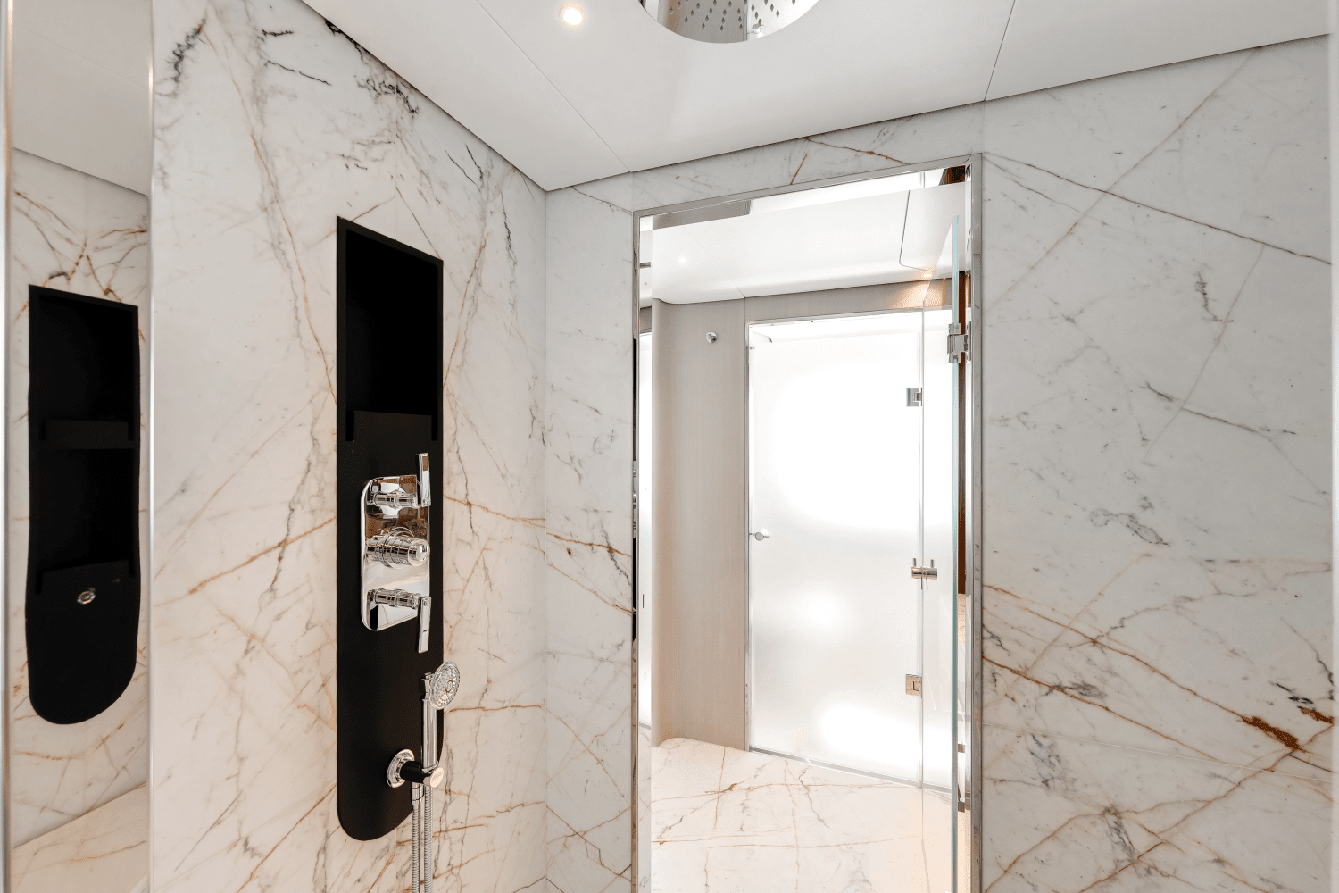 The yacht accommodates guests across five luxurious cabins, including a full-beam master suite on the main deck, VIP cabin, and additional guest staterooms. Each cabin features a private en-suite bathroom, ensuring comfort and privacy throughout extended charters