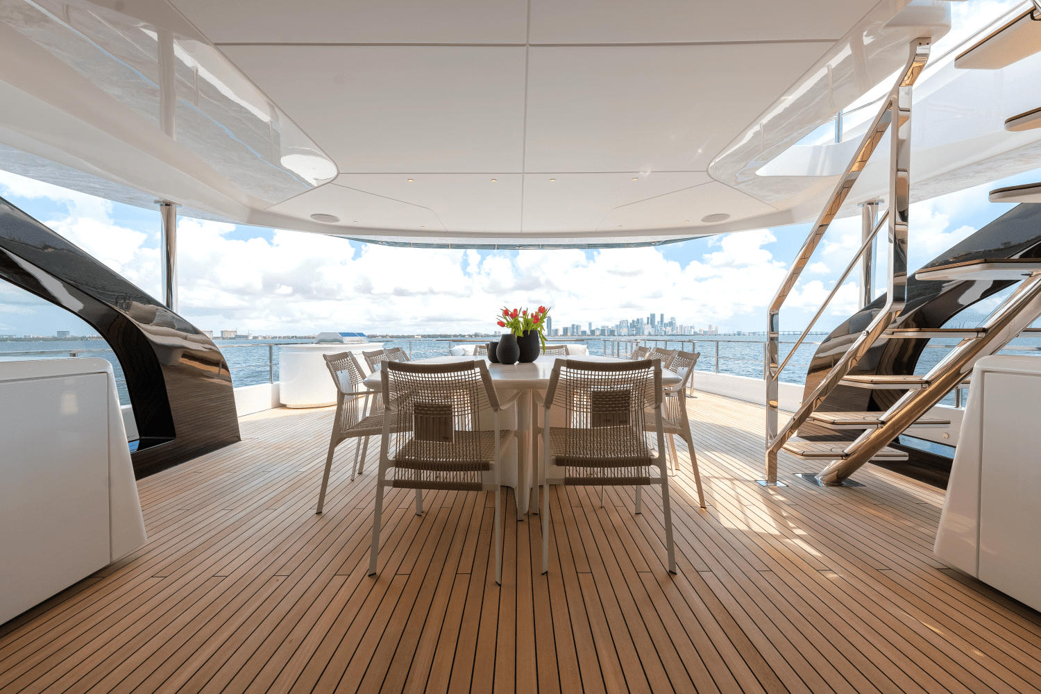 The Azimut Grande 36 Metri offers an exceptional variety of exterior spaces across multiple levels. The aft deck supports elegant dining and social gatherings, while the flybridge provides expansive lounging areas, sunpads, and a bar with unobstructed views.