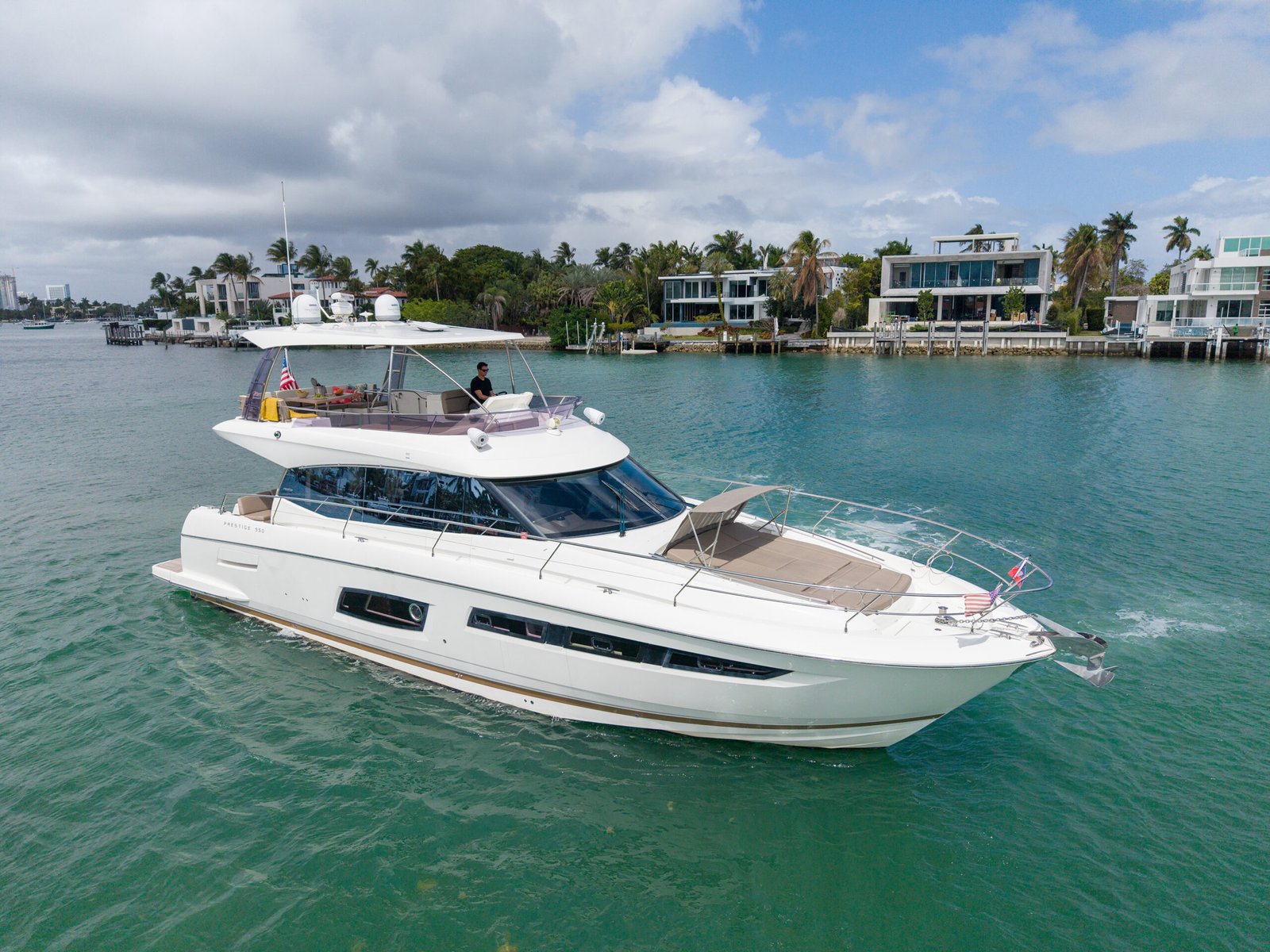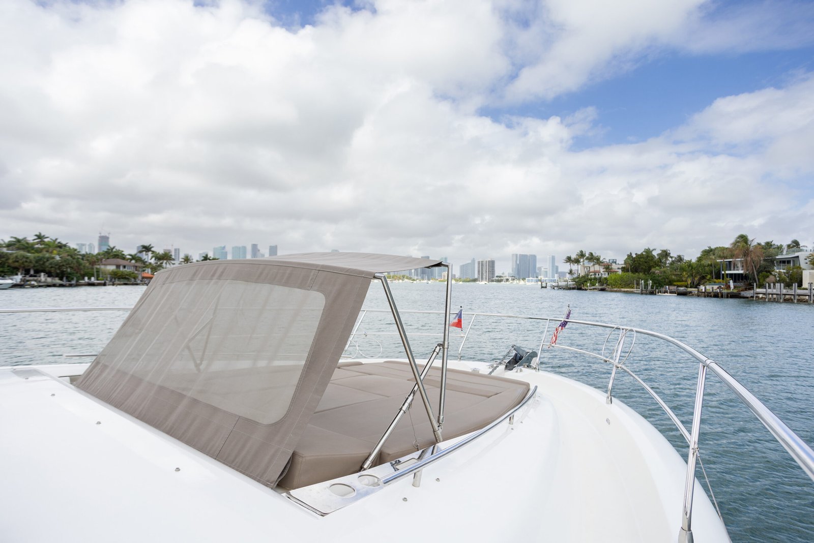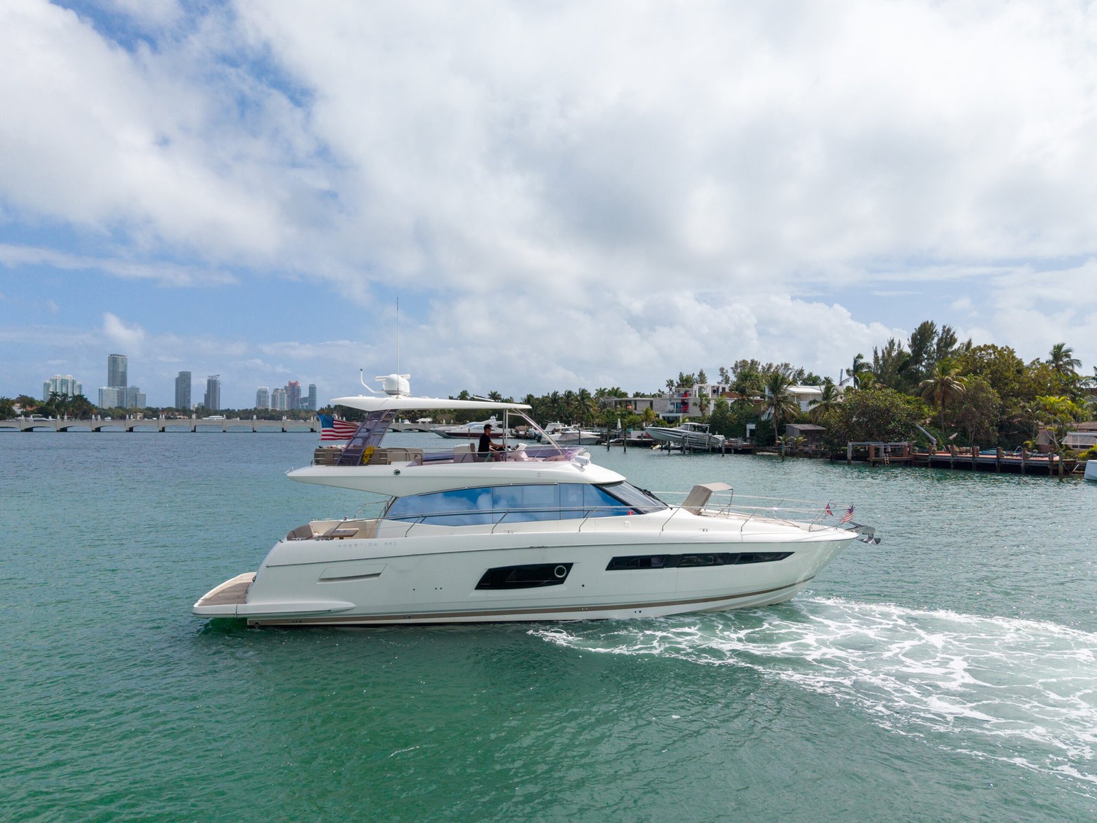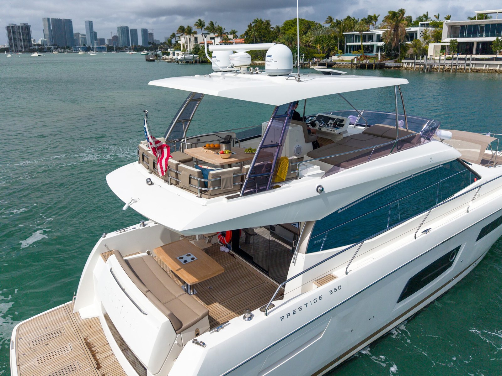 A typical day aboard the Prestige 550 begins with a calm, confident departure from the marina. Cruising through Biscayne Bay, the yacht maintains a stable, predictable rhythm that allows guests to relax immediately.