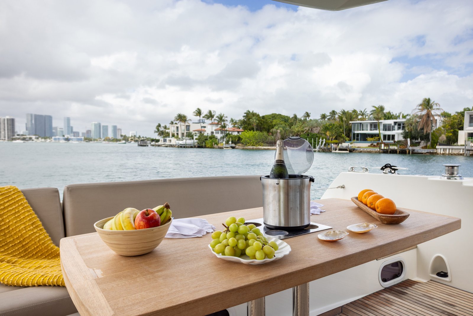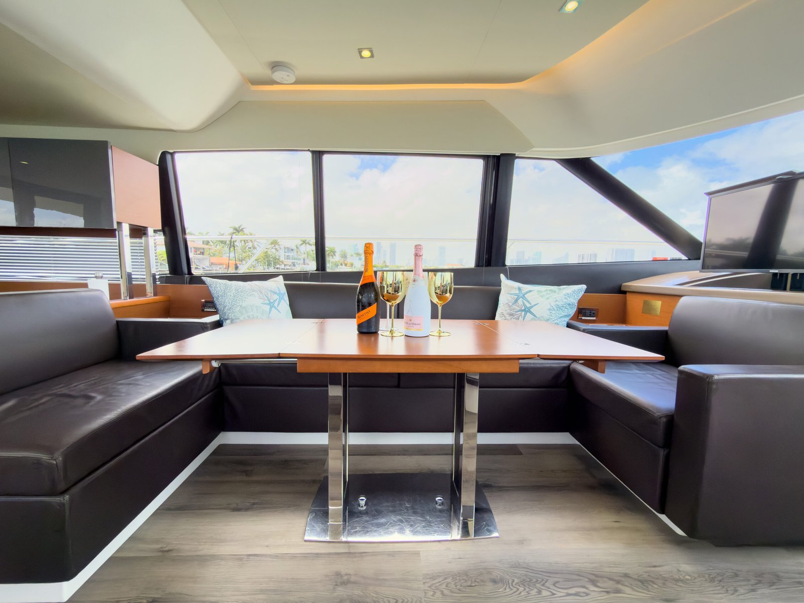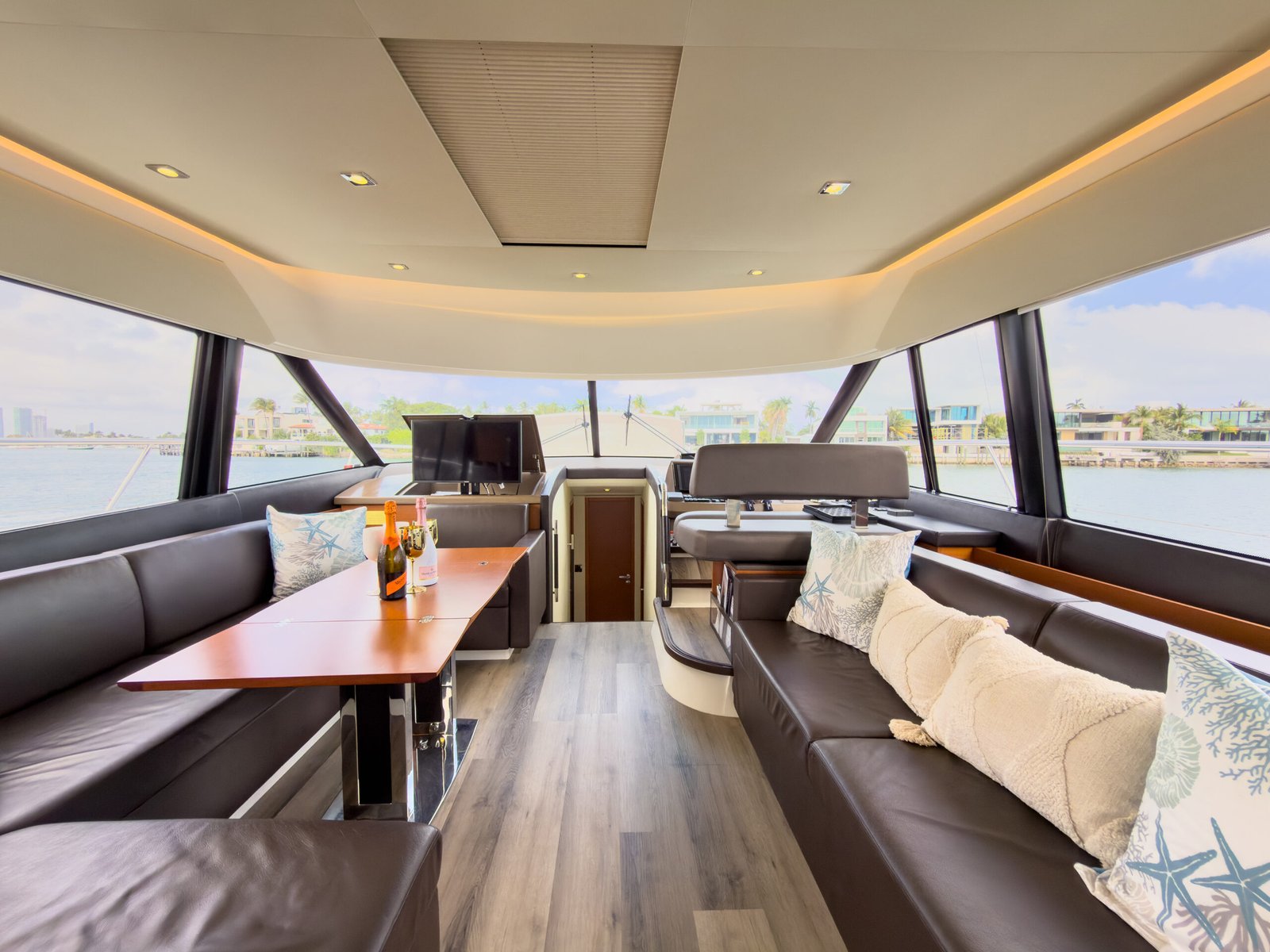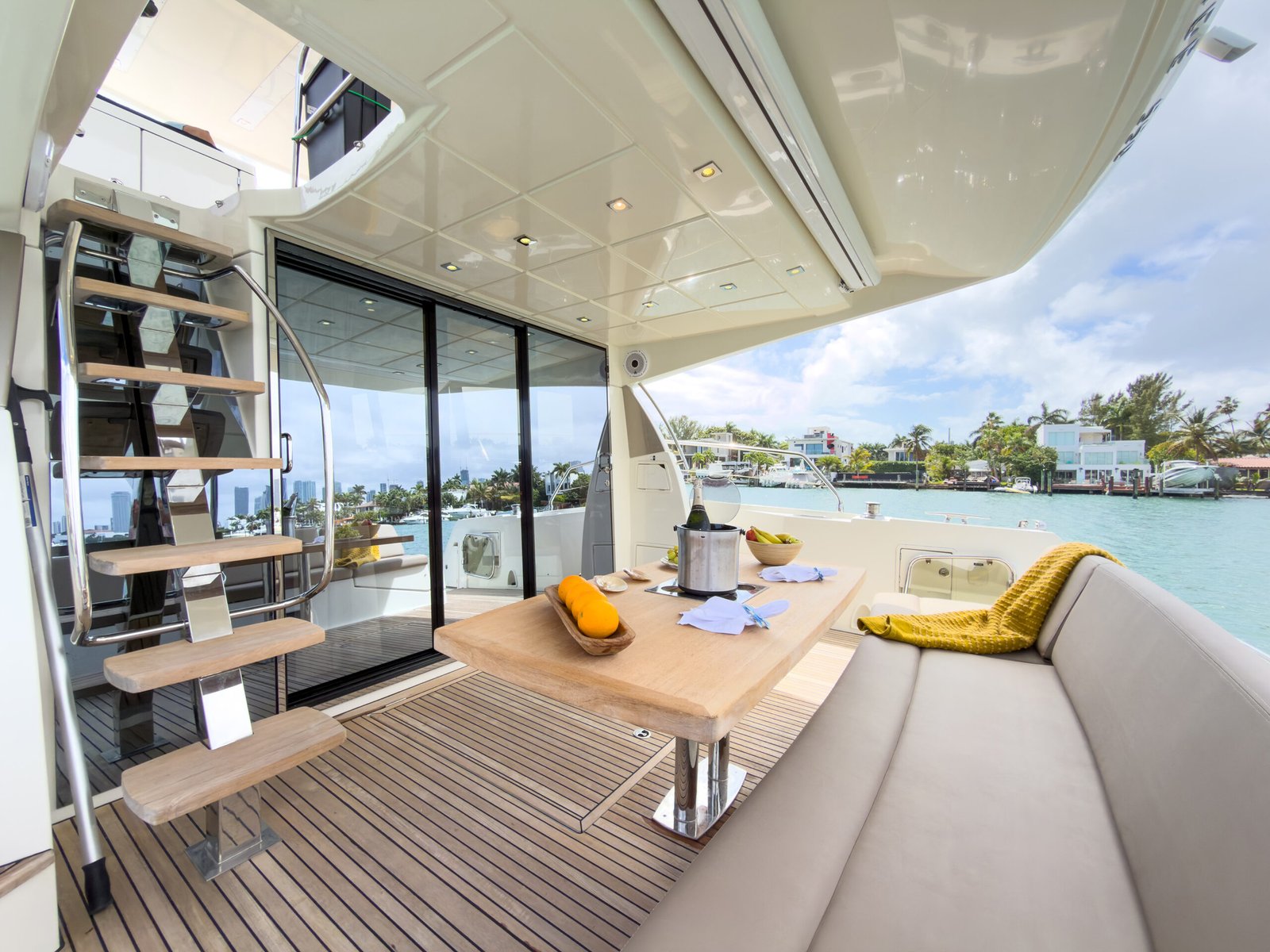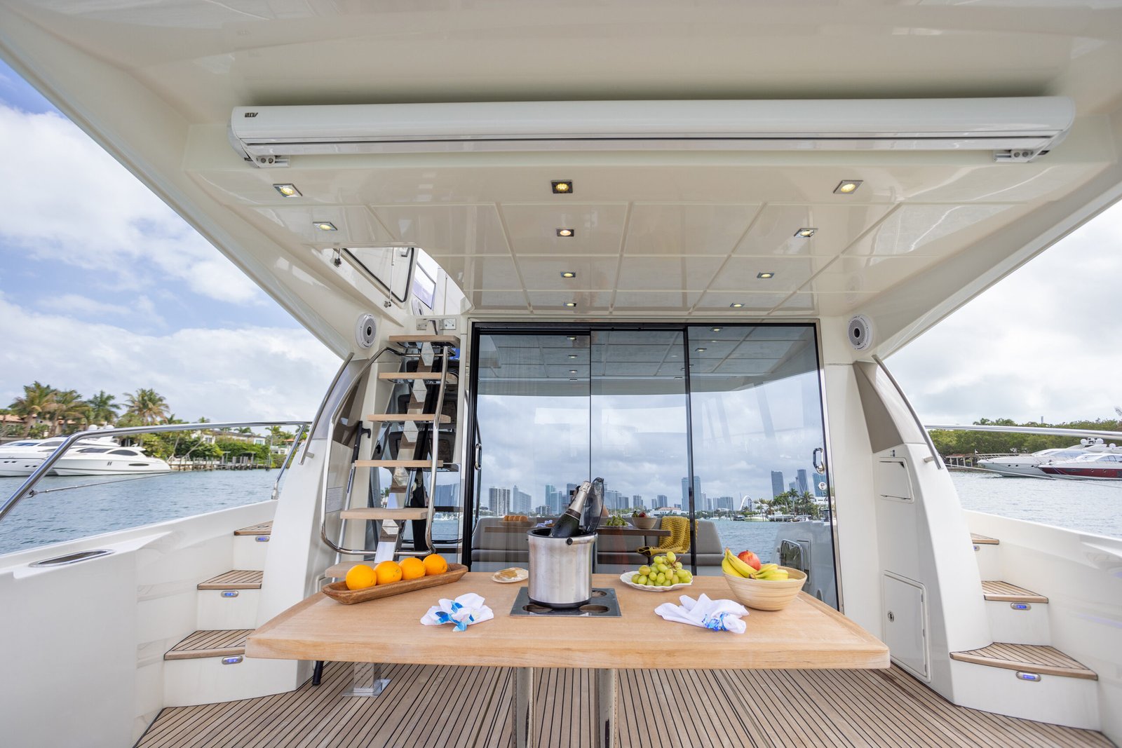 A typical day aboard the Prestige 550 begins with a calm, confident departure from the marina. Cruising through Biscayne Bay, the yacht maintains a stable, predictable rhythm that allows guests to relax immediately.