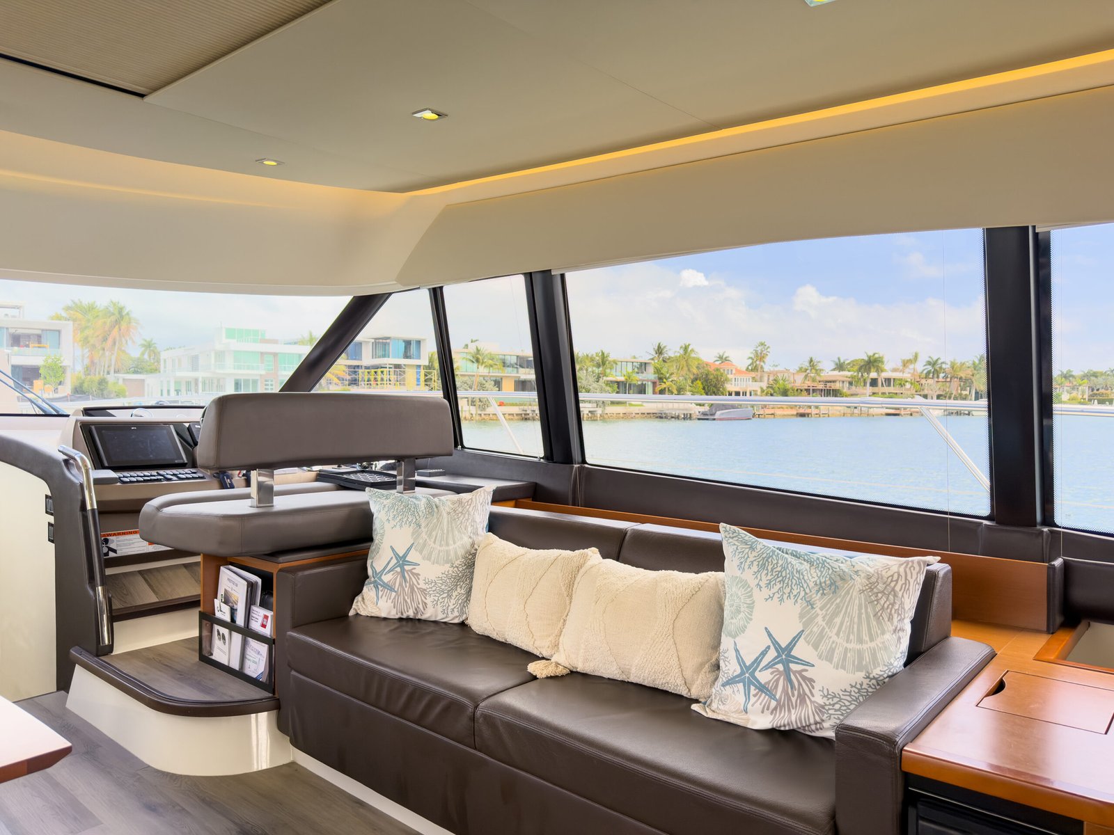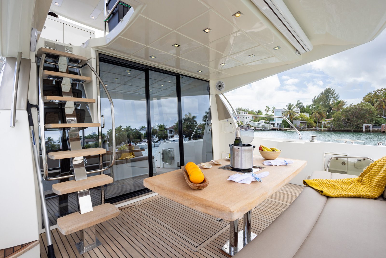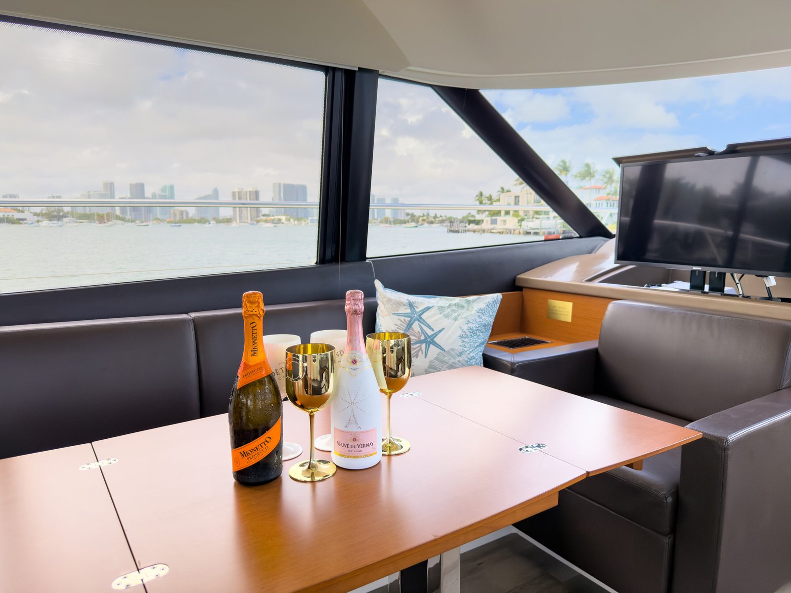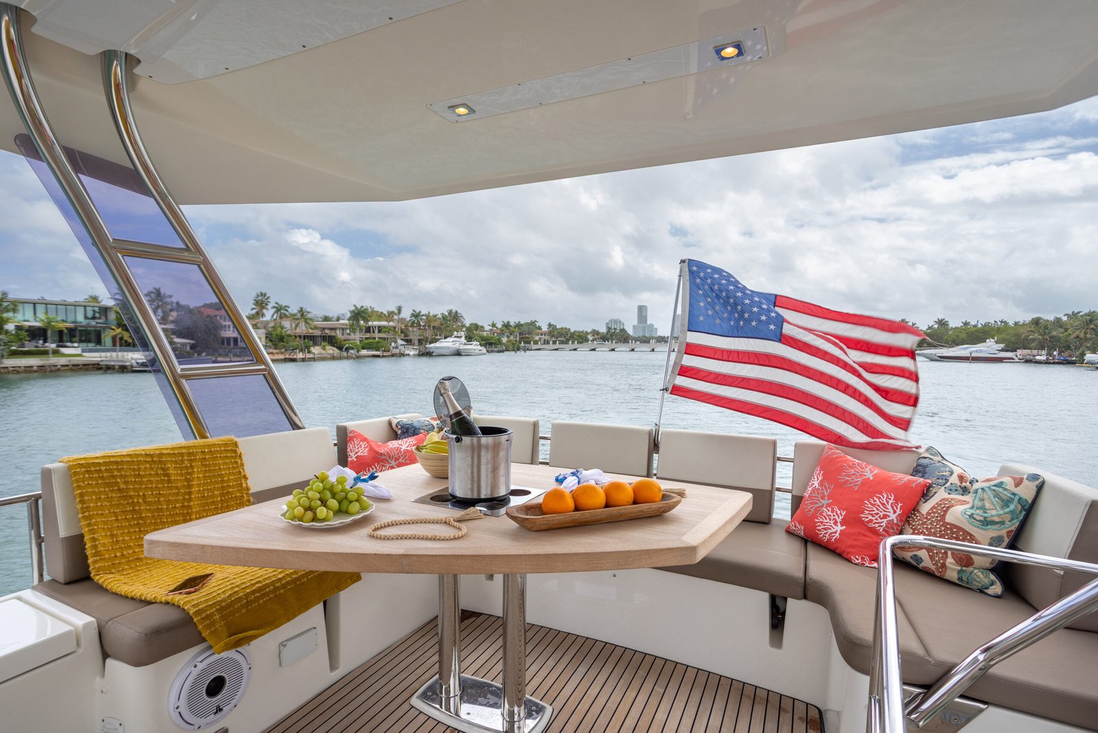 A typical day aboard the Prestige 550 begins with a calm, confident departure from the marina. Cruising through Biscayne Bay, the yacht maintains a stable, predictable rhythm that allows guests to relax immediately.