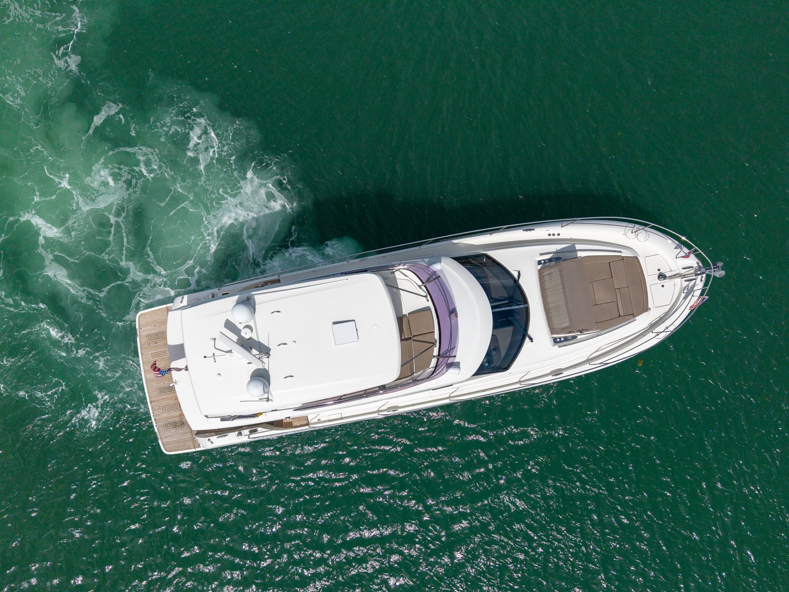 Popular itineraries include Star Island, Miami Beach, Key Biscayne, and Monument Island. At anchor, the flybridge becomes the social centerpiece, while the aft cockpit and foredeck provide alternative spaces for dining, conversation, and quiet enjoyment of the water.