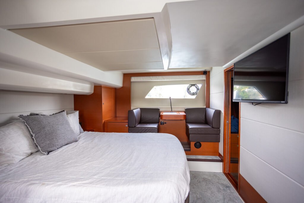 The yacht accommodates guests across three cabins, including a full-beam master suite, VIP cabin, and a guest cabin. This configuration supports day charters as well as overnight and multi-day experiences with ease.