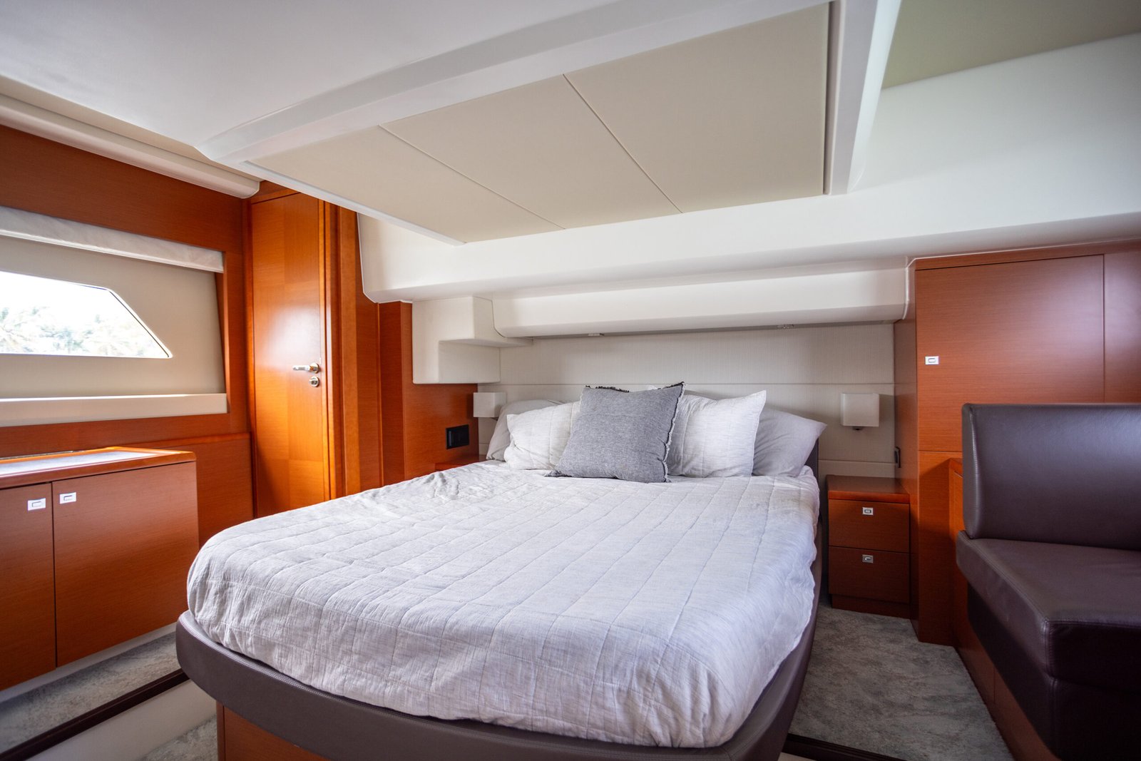 The yacht accommodates guests across four well-appointed cabins, including a full-beam master suite, VIP cabin, and additional guest staterooms. Each cabin features a private en-suite bathroom, ensuring comfort and privacy during multi-day charters.